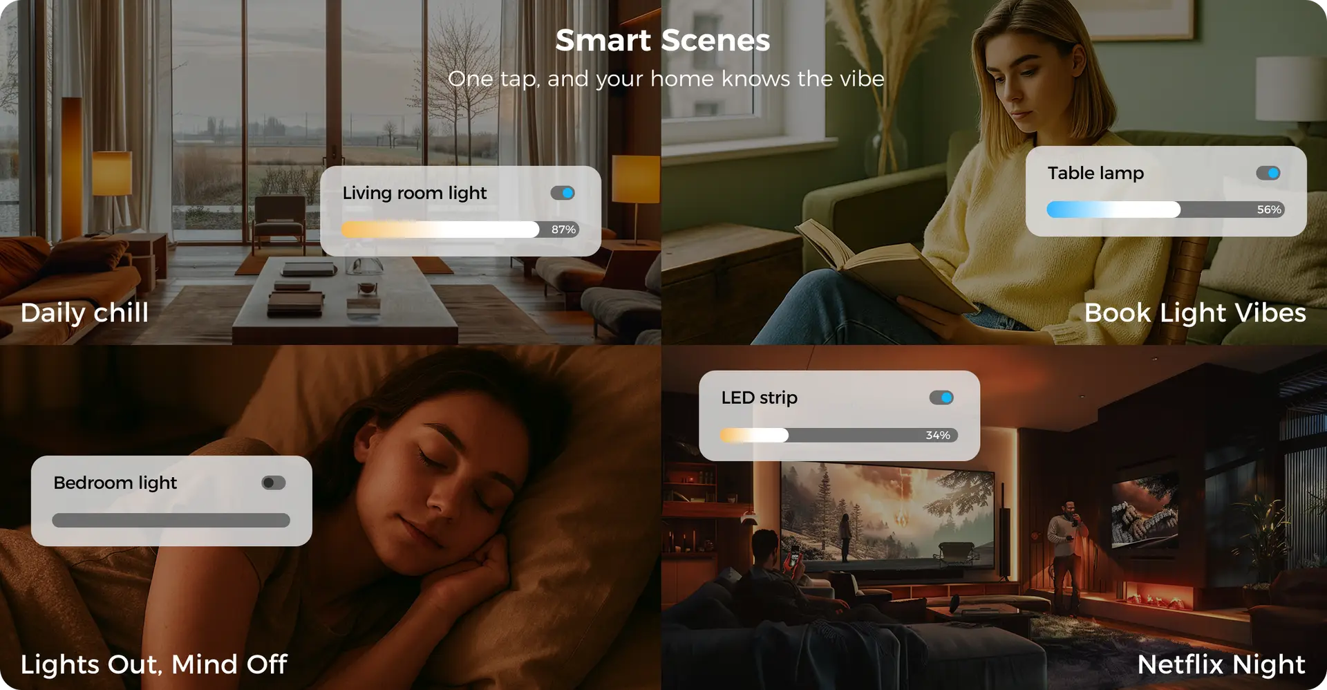 Let the lights adjust as the sun sets. Let the curtains move when you wake. Ecospace syncs your home with your rhythm — one tap, one command, or simply by being there.